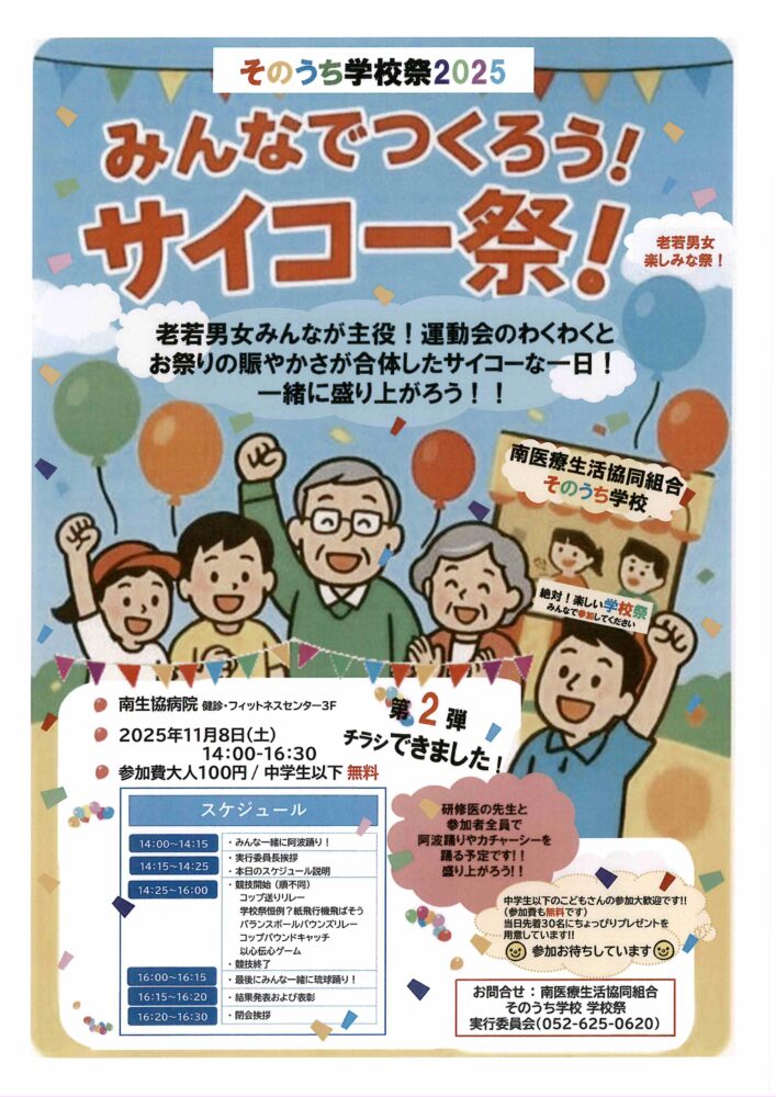 そのうち学校祭2025「みんなでつくろう!サイコー祭!~老若男女楽しみな祭!~」を11月8日(土)14:00~16:30にコープ健診フィットネスセンター3F(総合病院南生協病院内)にて開催します。
