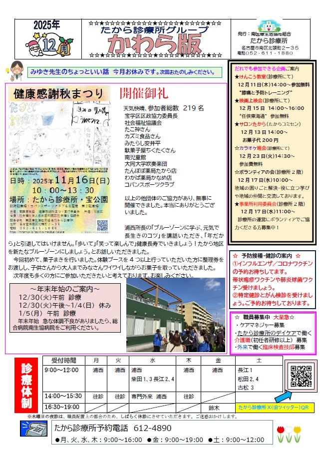 たから診療所 たから診療所はこちら▶ TOP > たから診療所 > たから診療所 かわら版 12月号 2025/12/03 たから診療所 かわら版 12月号 一覧に戻る Calendar 12月 2025 月 火 水 木 金 土 日 1234567 891011121314 15161718192021 22232425262728 293031 « 11月 Recent Posts (no title) たから診療所 かわら版 12月号 年末年始の診療体制のおしらせ 2025年度 富木島診療所で受けられるがん検診一覧 「おたがいさまの福祉まちづくり交流会」開催のお知らせ Archives 2025年12月 2025年11月 2025年10月 2025年9月 2025年8月 2025年7月 2025年6月 2025年5月 2025年4月 2025年3月 2025年2月 2025年1月 2024年12月 2024年11月 2024年10月 2024年9月 2024年8月 2024年7月 2024年6月 2024年5月 2024年4月 2024年3月 2024年2月 2024年1月 2023年12月 2023年11月 2023年10月 2023年9月 2023年8月 2023年7月 2023年6月 2023年5月 2023年4月 2023年3月 2023年2月 2023年1月