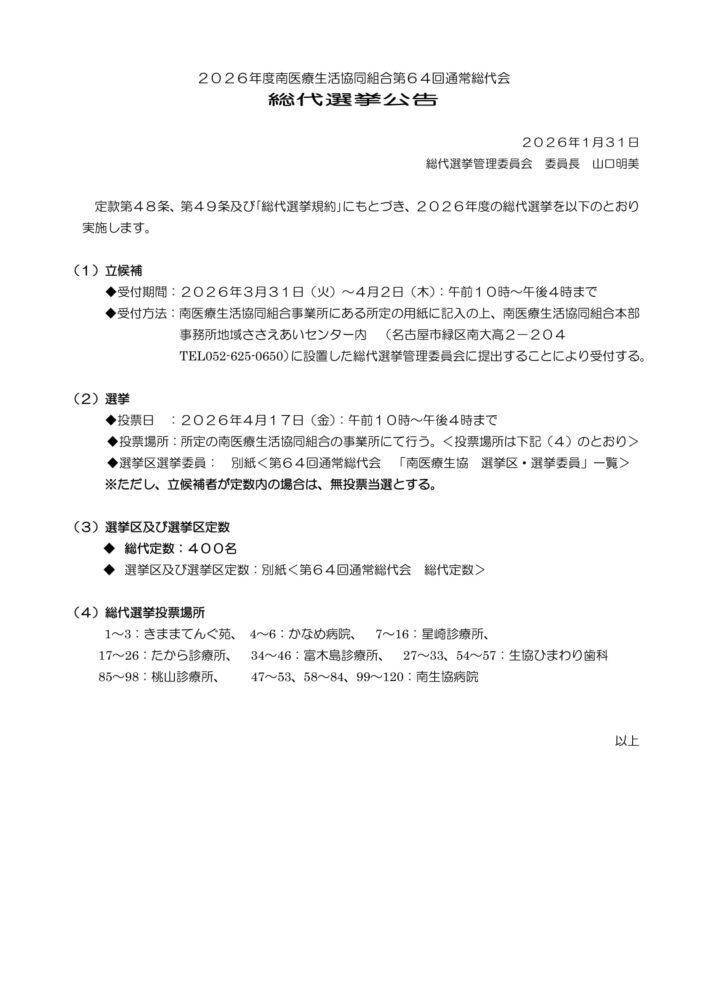 お知らせ TOP > お知らせ, 電子公告 > 2026年度 総代選挙公告 2026年1月31日 2026/01/31 2026年度 総代選挙公告 2026年1月31日 << 前の記事へ 一覧に戻る 次の記事へ >> カレンダー 2026年2月 月 火 水 木 金 土 日 1 2345678 9101112131415 16171819202122 232425262728 « 1月 最近の投稿 2026年度 第64回通常総代会公告 2026年1月31日 2026年度 総代選挙公告 2026年1月31日 2026年度 選挙区及び総代選挙定数 2026年1月31日 1月 介護事業所空き枠情報 12月 介護事業所空き枠情報 アーカイブ 2026年1月 2025年12月 2025年11月 2025年9月 2025年8月
